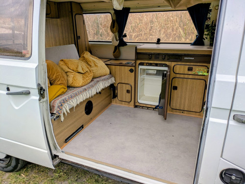 Es handelt sich um einen wunderschönen VW T3 Camper mit Aufstelldach. Original VW Westfalia Ausbau mit Hecktransportkiste.