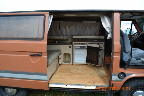 Anhängerkupplung, Standheizung (nicht in Betrieb), Gasanlage fachmännisch demontiert, Elektro Außenanschluß, beidseitig Pilotensitze ISRI, original Kühlschrank und Westfalia-Ausbau