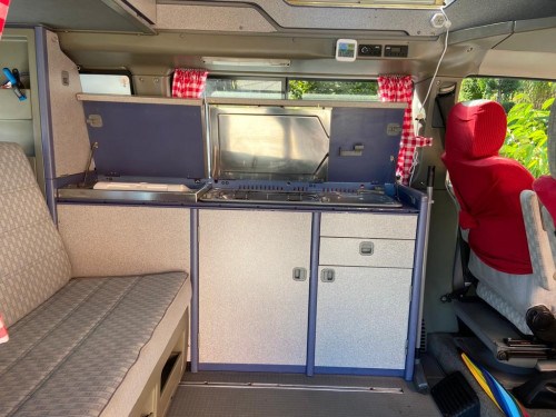 Schlafplätze: unten 2 Erwachsene, oben 1 Erwachsener oder zwei Kinder. Fahrer- und Beifahrersitz können gedreht werden, sodass vier Personen am Tisch sitzen können (Tisch ist in der Rücksitzbank verstaut). Dazu gibt‘s ein Berger Traveller Busvorzelt und Berger Thermomatten Set 3- tlg.